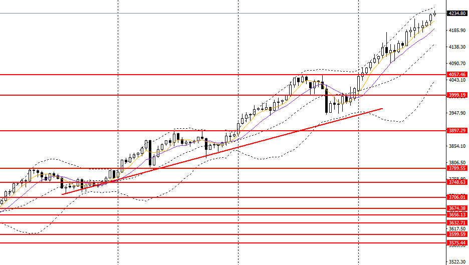 黄金连日拉升,上破日线布林上轨,日线RSI继续走高,短线走势仍强劲,4230附近企稳可继续做多。黄金/人民币如于967附近企稳可进多。