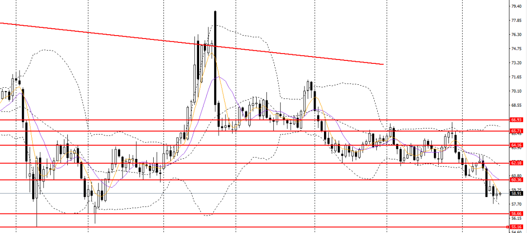 美原油收十字阳线,仍承压于5日均线,日线RSI仍位于50之下,短线走势仍偏弱,60附近承压可继续进空,后市大概率将回踩55-56。
