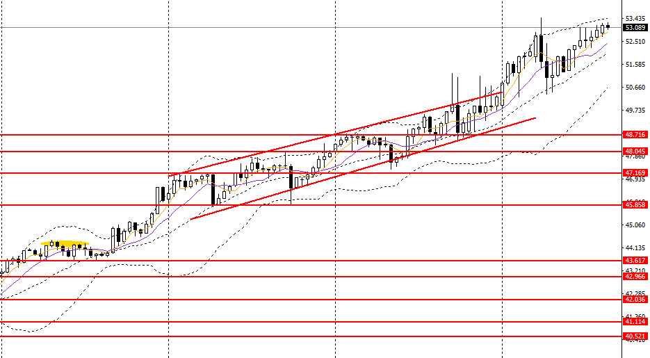 白银日线呈多方炮,徘徊于日线布林上轨附近,日线RSI位于超买区,4小时逼近前高,多单仍可持有,后市有望继续上探55。