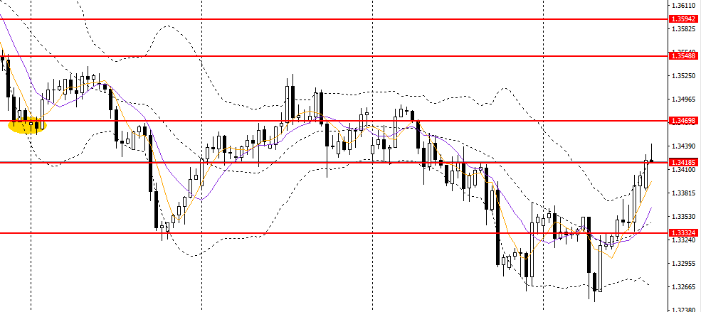镑美收看涨吞没阳柱,上破10日均线,4小时站上1.34关口,短线趋势转强,如于1.34附近企稳可继续做多,短线仍有望上探1.3480-1.35。