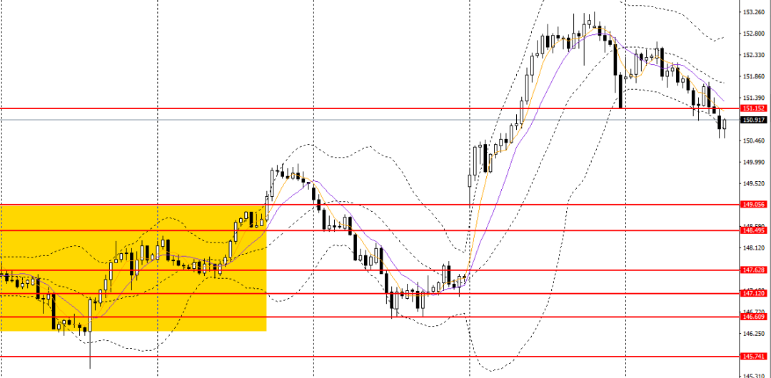 美日延续回落,日线RSI进一步回落,4小时下破151-151.20支撑带,如于151附近继续承压可延续高空思路。