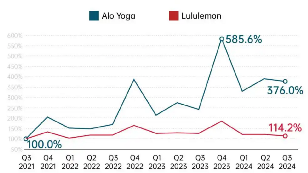 在明确这一市场结构需求的基础下,户外品牌的设计逐渐不再局限于硬核小众的“男性专属”,它们开始注重户外服饰的全域渗透,打造多场景适用的时尚户外穿搭。女性悦己语境崛起的也让时尚设计成为了新的消费驱动力:在Luluemon称霸的健身市场中,Alo秉承着Studio-to-Street的理念迅速占有了市场,成为全新的时尚生活符号。2024年三季度中,Alo的销售额同比增长376%,远高于Lululemon的114.2%,由数据中可以明确得出品牌重视女性消费者时尚户外穿搭、情感价值双重需求的必要性。而高梵的黑金壳鹅绒服—云锦系列,无疑精准洞察了这一市场变化趋势。
