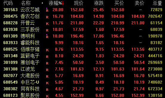 存储芯片概念今日再度活跃,截至收盘,云汉芯城20%涨停,香农芯创涨近17%创出新高,开普云涨近12%,德明利等亦涨停;佰维存储涨近9%,盘中亦创出新高。