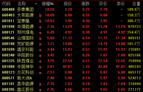 煤炭板块今日大幅走高,大有能源、宝泰隆涨停,近5个交易日双双斩获4个涨停板,安泰集团亦涨停,中煤能源涨超7%。