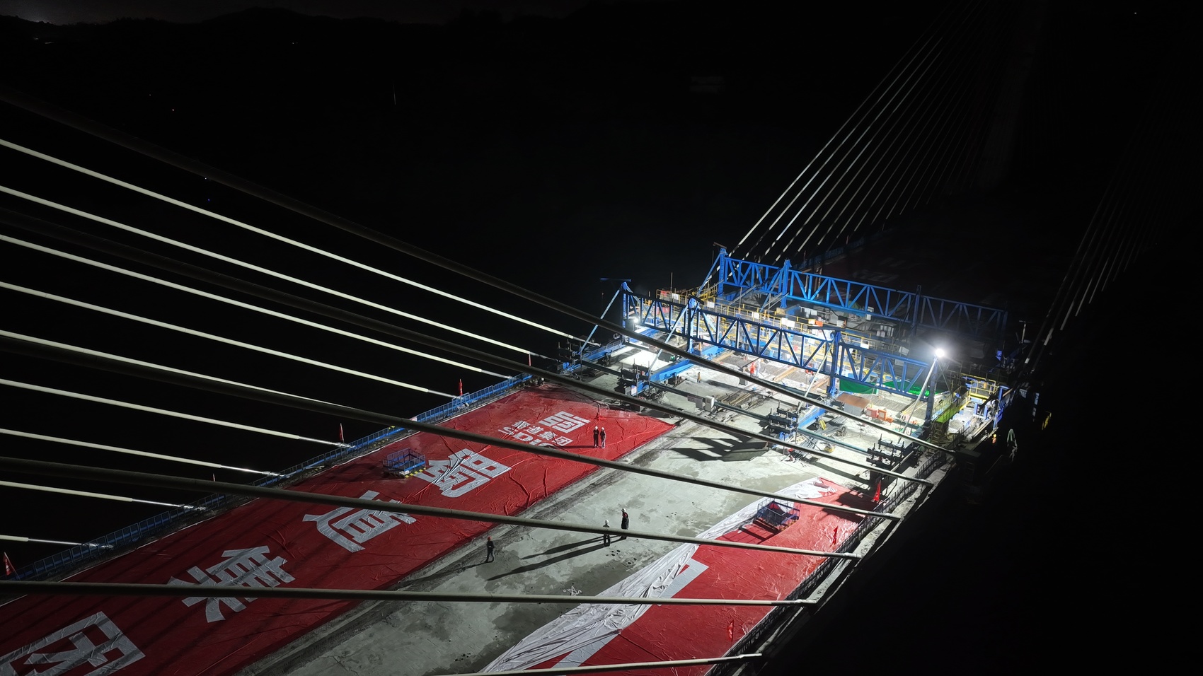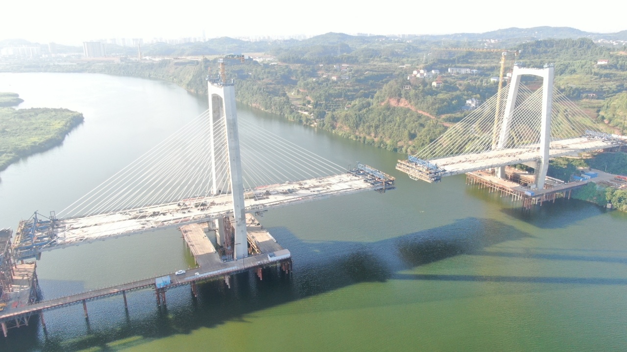 嘉陵江特大桥横跨南充市高坪区都京街道和嘉陵区文峰街道之间的江面,全长2309米,主桥长500米。大桥采用半漂浮体系对称双塔双索面混凝土斜拉桥设计,主塔为花瓶索塔造型,高116.55米,约40层楼高。本次主梁施工采用后支点挂篮对称悬臂浇筑工艺,4个作业点同步推进,通过电子液压系统精确控制,最终将合龙时桥面高差严格控制在2厘米以内。