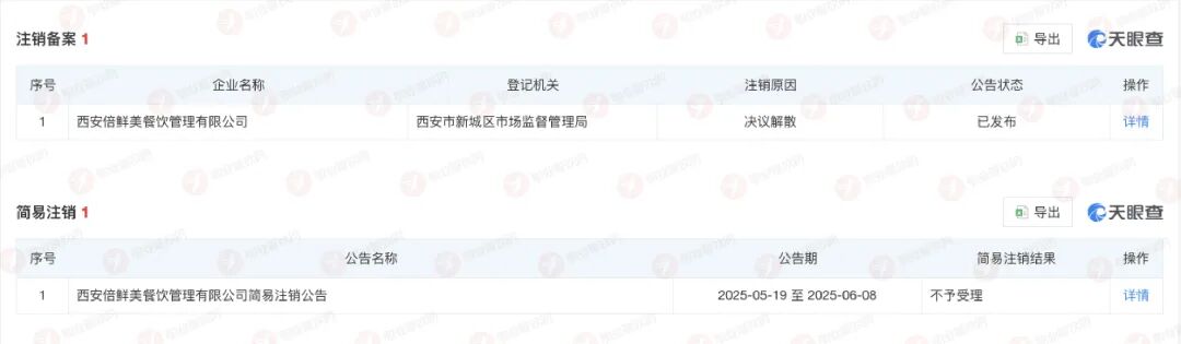 这场闭店潮并非毫无征兆。往前倒推三个月,其关联主体西安倍鲜美餐饮管理有限公司就新增了注销备案;而更早之前,该公司曾尝试启动简易注销程序,但最终不了了之。