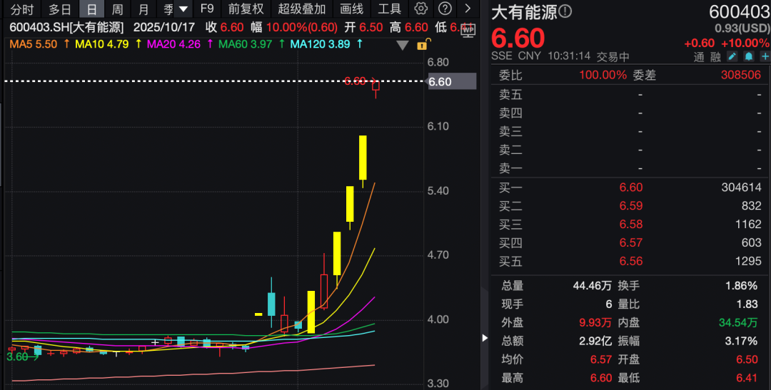 盘初,煤炭板块延续强势,大有能源6天5板,宝泰隆、郑州煤电、云煤能源、中煤能源、山煤国际跟涨。