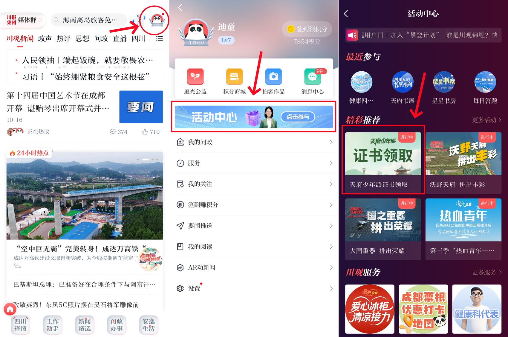 打开川观新闻APP,首页右上角“用户头像”-“活动中心”,进入找到“天府少年派证书领取”图片,点击即可进入活动。