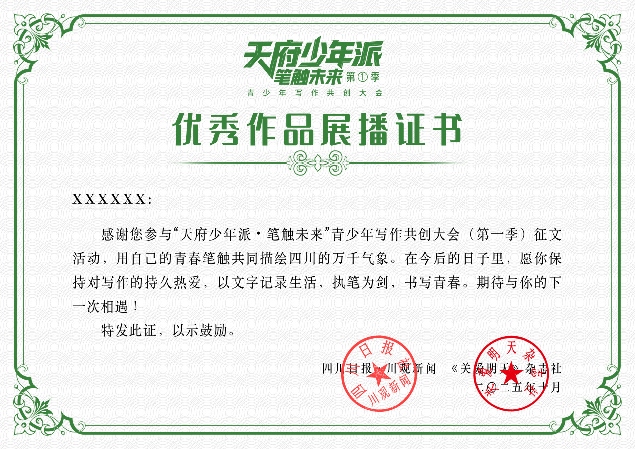 7月1日,由四川日报社、《关爱明天》杂志社联合主办的“天府少年派・笔触未来”青少年写作共创大会(第一季)正式启动,本季主题为“锦绣天府·安逸四川”,邀请全国中小学生用青春的笔触描绘四川的自然之美、人文之韵、发展之变,让世界看见少年眼中的天府故事。