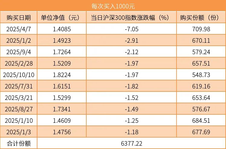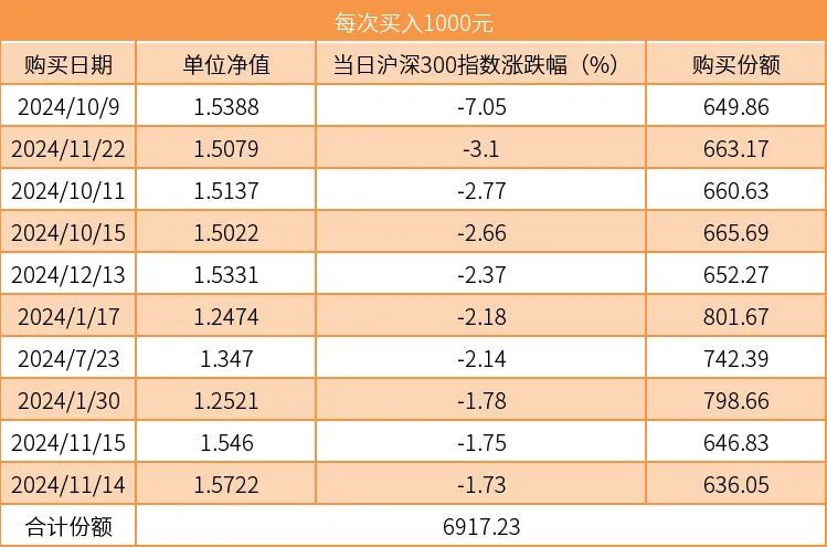 那么,假设我们真有“上帝视角”,赶上了每一次大盘下跌并抄底基金,是否可以如预想中那样获得更多收益?我们调取了指数基金(与大盘走势高度相关):易方达沪深300ETF联接C的真实数据,来看看在“精准踩跌”的情况下,“逢跌加仓”的策略到底靠不靠谱。