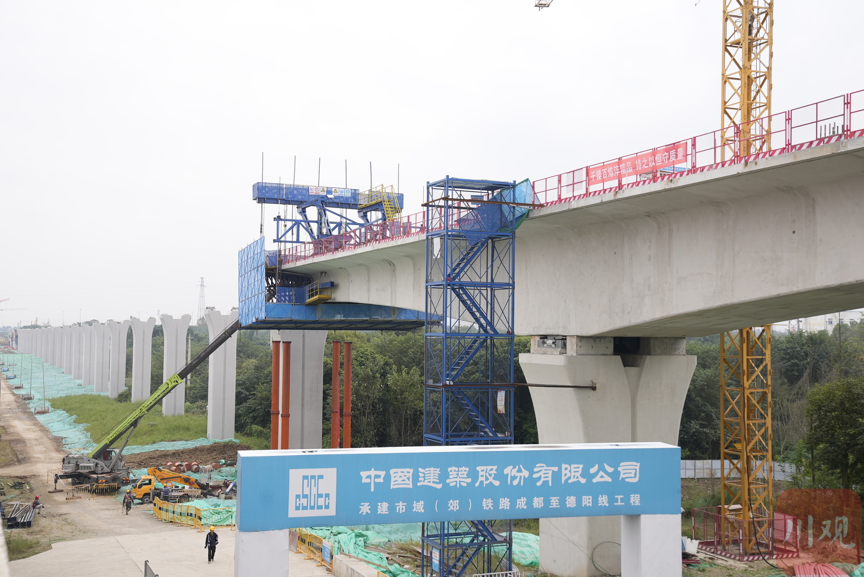 在德阳市域铁路成德S11线鸭子河北岸,全长496米的大桥,桩基、承台、桥墩已全部完成,4座桥墩稳稳矗立河中,河面上桥梁段也已架设到位。北岸31、32号墩之间,移动挂篮正在作业,两段桥体即将“牵手”合龙。“全桥预计12月底实现整体合龙。”四川成德轨道交通有限公司土建四工区业主代表张智勇介绍,距离大桥不远处的三星堆站也即将破土动工。