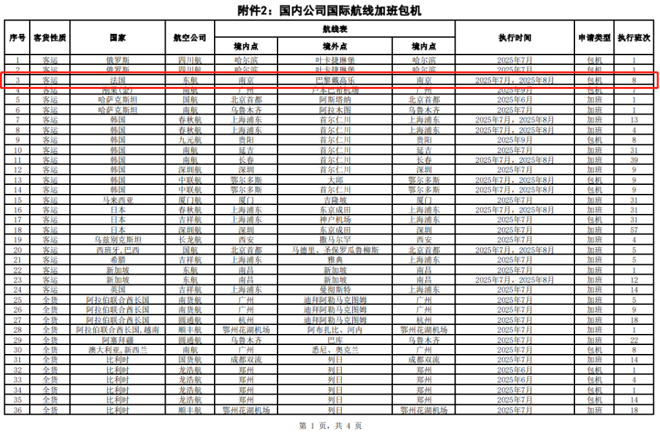 今年7月9日,南京开通直飞巴黎航线,不过从民航局披露来看,这条航线在7、8月属于加班包机性质,执行班期为一周一班,一共8班,但销售端和定期航班体验无差别。该航线在9月11日-30日期间,并无航班安排,一度似乎偃旗息鼓。