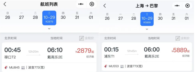 从东航小程序看,以10月29日为例,南京单程飞巴黎的经济舱票价2879元起,相比同日上海单程飞巴黎的经济舱票价(5889元起)便宜一半。