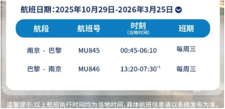 近期,东航宣布,10月29日起恢复南京-巴黎直飞航线,每周一班(周三)。