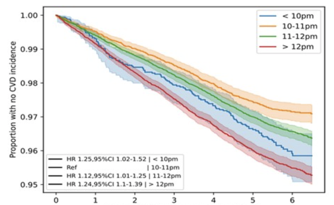 研究人员把这些人分成四组:晚上 10:00 前入睡、晚上 10:00~10:59 入睡、晚上 11:00~11:59 入睡和午夜后才入睡。然后,他们对参与者进行了平均 5.7 年的随访,统计谁在这段时间里新发了心血管疾病(如心梗、中风、心衰等)。