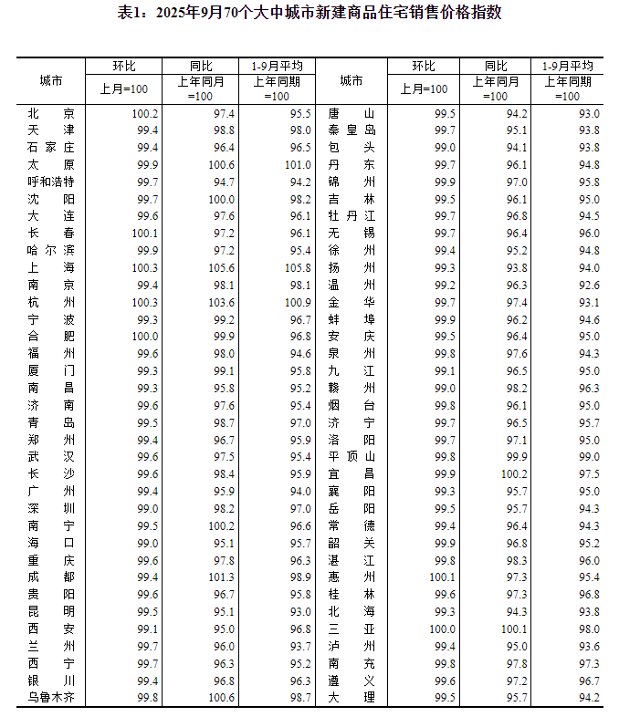 2025年9月份70个大中城市商品住宅销售价格变动情况