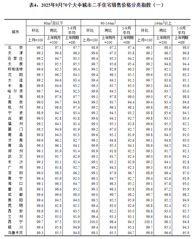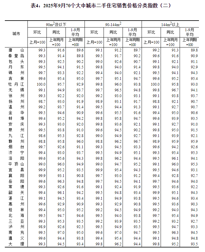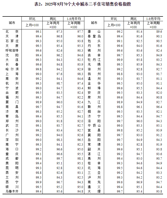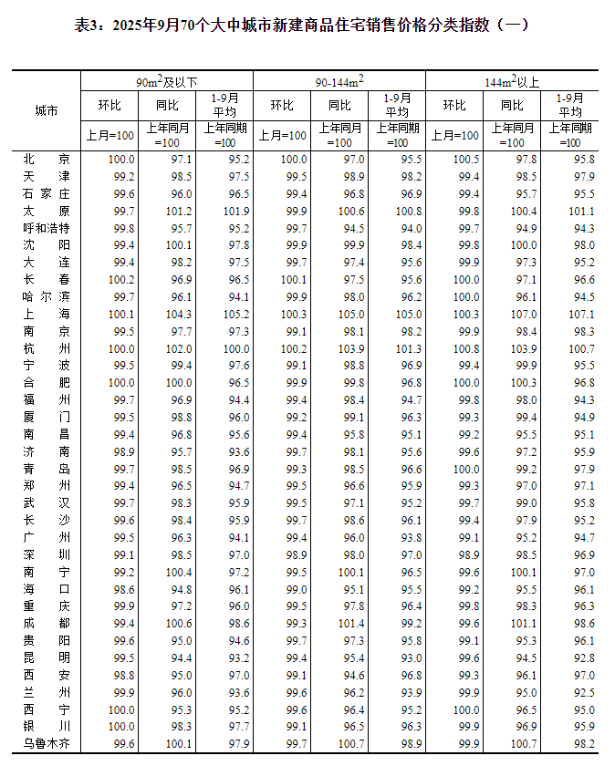 2025年9月份,70个大中城市中,各线城市商品住宅销售价格环比下降,同比降幅继续呈收窄态势。
