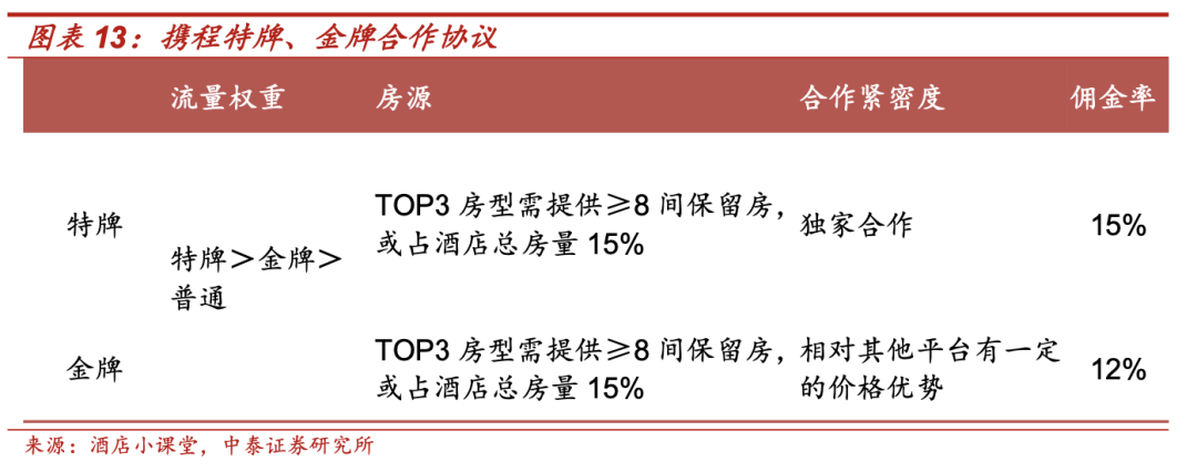 据中泰证券披露,携程目前合作的酒店大概分为三种,分别是独家合作的特牌、保障携程平台更低价的金牌,以及普通合作模式,其中,特牌和金牌的佣金率分别为15%、12%。