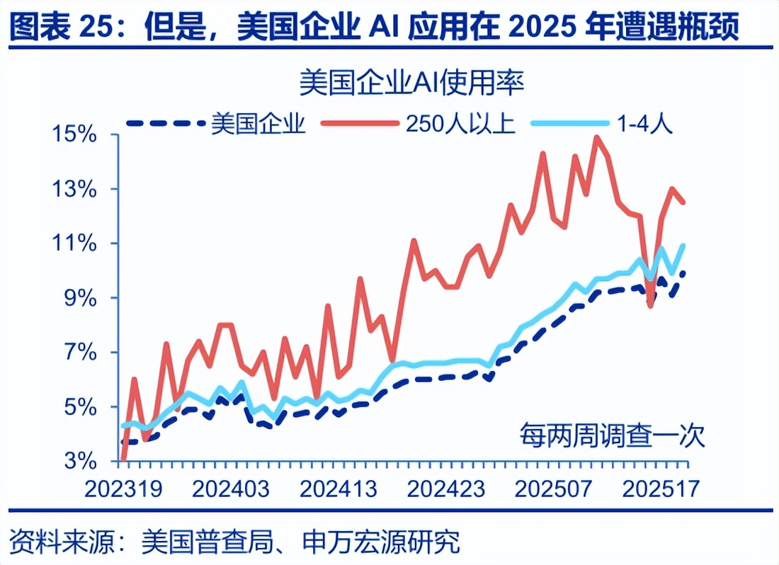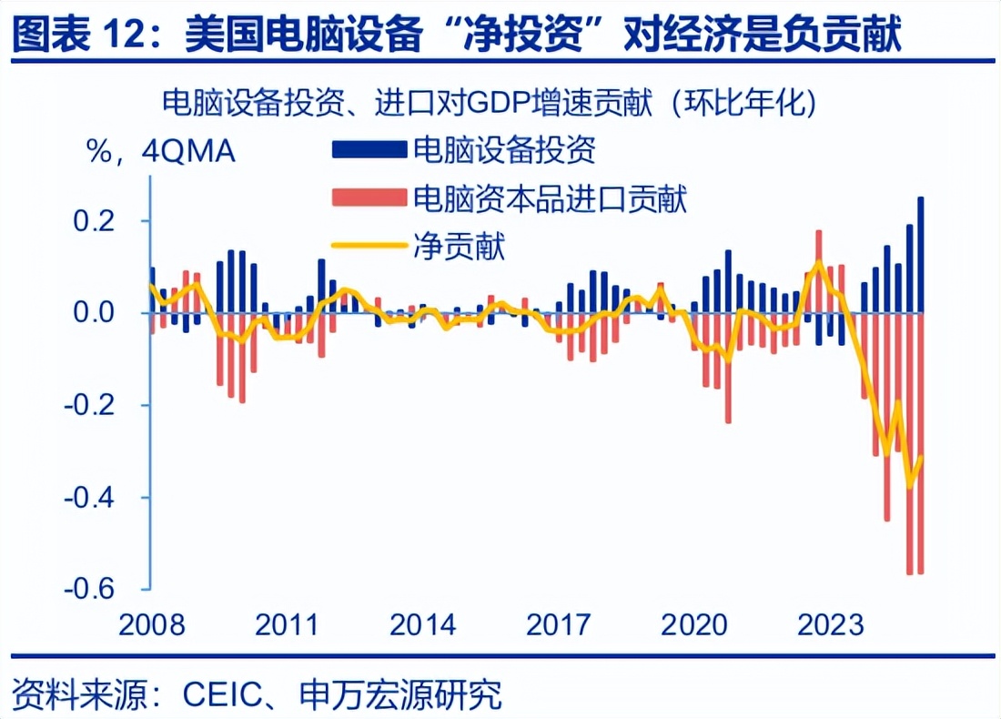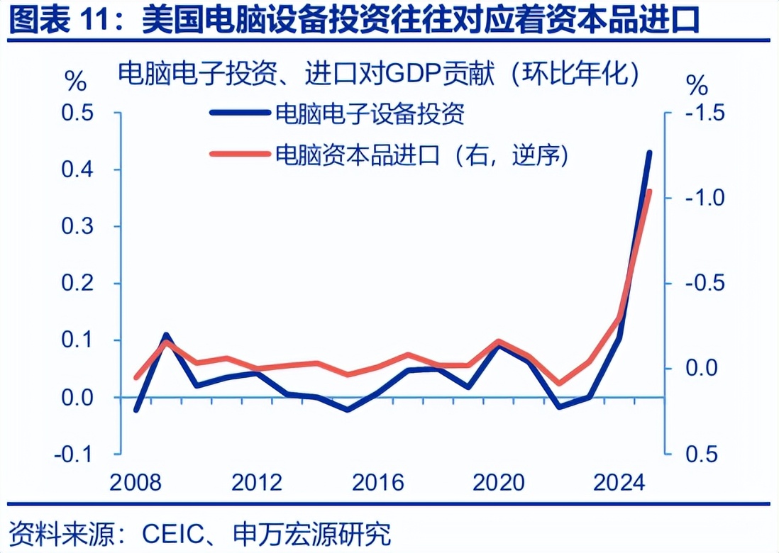 宏观视角下,2025年AI投资对经济增速的贡献与居民消费基本持平,但不可忽视进口的拖累。2025年上半年,美国居民消费、AI投资分别贡献经济增速1.1、1.0个百分点;但是,自2023年以来,电脑设备“净投资”(投资-进口)对经济呈现负贡献,不可忽视来自于进口的拖累。