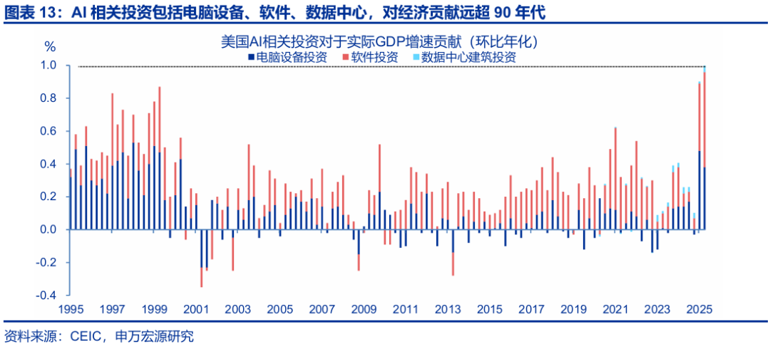 宏观视角下,2025年美国AI投资对经济增速的贡献与居民消费基本持平,但不可忽视进口的拖累。由于美国居民消费占GDP比重达70%左右,因此在一贯认知中,美国经济往往是由居民消费推动的。但是,2025年上半年,美国居民消费、AI相关投资(电脑设备、软件、数据中心)分别贡献实际GDP增速1.1、1.0个百分点,几乎持平。从历史上来看,2025年AI相关投资对经济增速的贡献已经超过90年代;但是,电脑设备投资对应电脑资本品进口,两者存在较强关系。并且,自2023年以来,美国电脑设备“净投资”(投资-进口)对经济呈现负贡献。所以,2025年上半年美国AI投资的确强劲,但若忽视进口拖累,就会显著高估AI投资的经济效益。