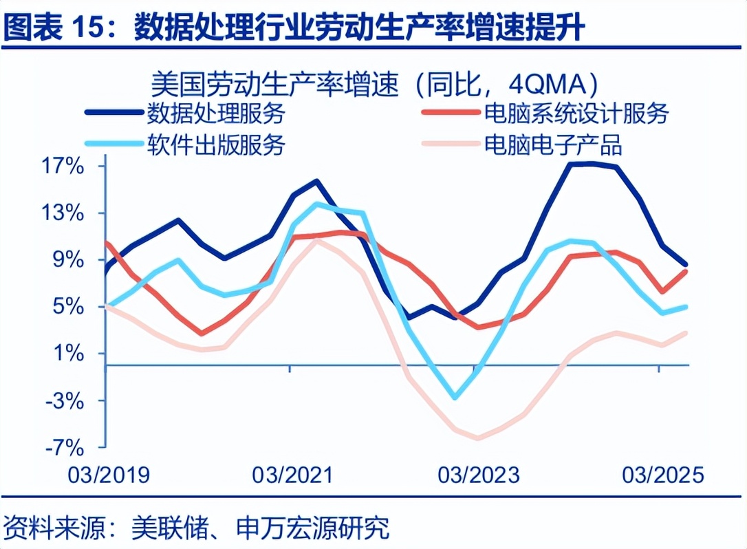 AI革命对生产率的提振效果已有所显现,但空间仍较大。上文提到,AI技术革命刺激资本开支,对于美国经济增速、股市均具备较大意义。不仅如此,此类“通用技术”也会带动全社会效率提升,类似的先例为内燃机、因特网等。根据AI提升工作效率的微观特征,AI的应用或可提升劳动生产率(Output per hour)。过去几年,美国劳动生产率增速相较疫情前的确有所提升,结构上,也可观察到AI相关产业的效率提升,如数据处理业。但是,此轮劳动生产率增速还未摆脱“低增长”区间。一方面,2019-2024年,美国劳动生产率增速为2.1%,仍低于1990-2000年、2000-2007年的2.2%、2.7%;另一方面,根据Kahn-Rich生产率趋势模型,截止2025Q2,美国处于劳动生产率“低增速”阶段的概率高达85%。