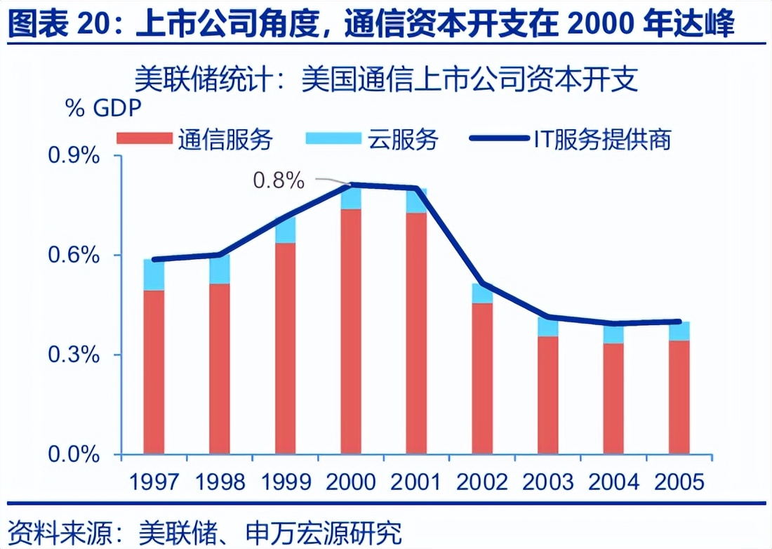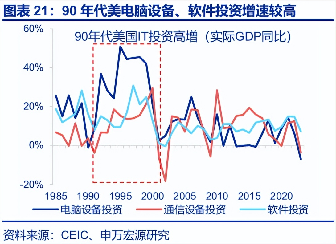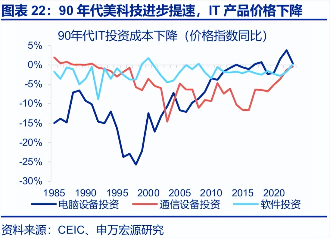 回顾历史,90年代美国互联网革命的特征为投资火热、生产率提升、成本下降。1)投资方面,美国信息通信资本开支占GDP比重在2000年达峰;2)美国劳动生产率增速提升,1995Q4-2004Q2增速高达3.1%;3)成本方面,电脑设备投资价格指数同比一度低至-25%。