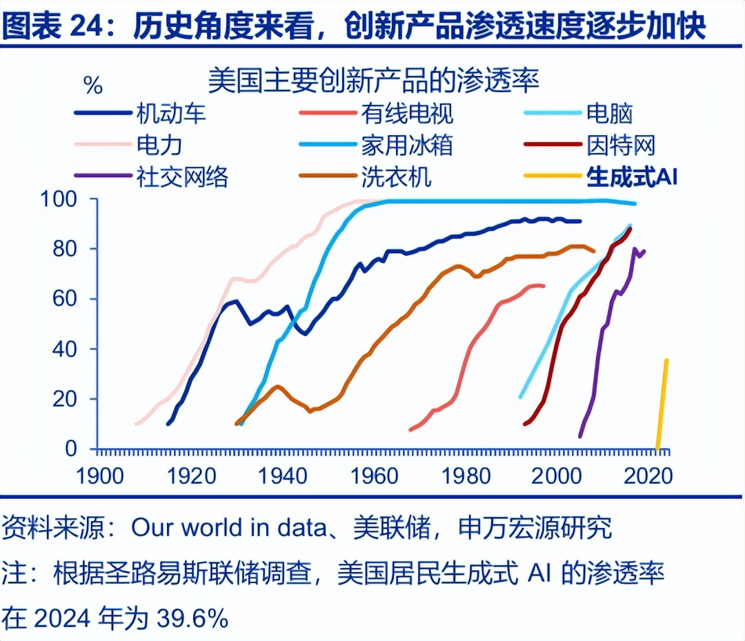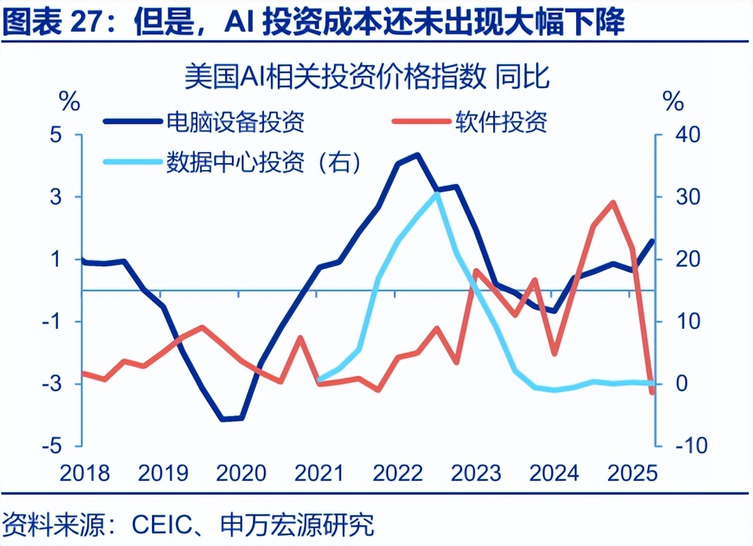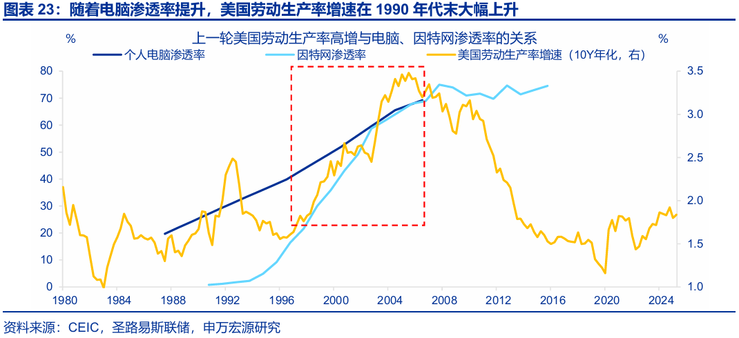回顾历史,90年代美国互联网革命的特征为投资火热、生产率提升、成本下降。1)投资方面,美国信息通信资本开支占GDP比重在2000年达到顶峰。90年代后期,电脑设备投资增速一度高达50%;2)随着个人电脑渗透率、因特网渗透率提升,美国劳动生产率增速随之提升,1995Q4-2004Q2增速高达3.1%,2022Q4-2025Q2增速仅为2.2%。3)成本方面,由于半导体技术突破和生产效率提升,90年代电脑、软件等设备投资成本下降。