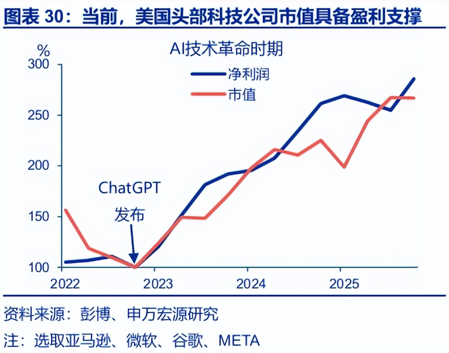 美国AI革命、资本开支是否处于“泡沫”之中?根据上文分析,投资、生产率、成本三大领域显示美国AI革命处于初期,AI提振生产率“任重道远”。过去几年,市场对于此轮美国AI资本开支可持续性的担忧层出不穷,甚至担忧在Mag7一骑绝尘的涨幅背后,存在着资产价格泡沫。从以下两个层面来看,当前AI热潮或并不处于“泡沫”之中:1)对比科网泡沫时期与当前头部科技公司的市值、净利润变化可见:互联网革命时期,头部科技公司市值涨幅远超利润;而2022年以来,头部公司市值涨幅与利润仍相对匹配,这表明股市上涨及资本开支加码背后有盈利支撑;2)从财务数据来看,Mag7公司现金/市值、ROE、净利率均高于科网泡沫时期的头部公司,说明当前AI科技领域投资建立在稳健的财务基础之上。