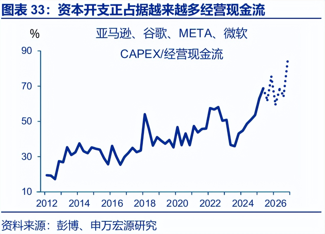 1)资本开支增加消耗自由现金流,科技企业寻求外部融资需求增加。根据市场预期,美国主要科技企业2026至2027年的资本开支力度仍将进一步提升。过去几年,科技企业资本开支提升已占据越来越多的经营现金流,导致企业自由现金流下降,进而推高了科技企业从外部融资的需求。这意味着,美国科技企业未来的资本开支,或将更容易受到融资环境、市场对回报率诉求的影响;
