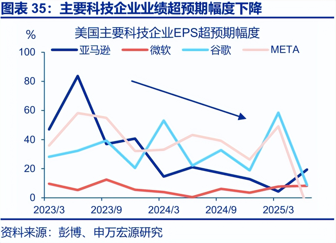 2)过去几年,美国科技企业盈利超预期幅度下降。若未来盈利走弱,则资本开支可持续性将受冲击。如前文所述,此轮科技企业资本开支的基础是其盈利能力。但自2023年起,美国主要科技企业业绩超预期的幅度逐步收窄,这一现象或反映出市场对科技企业业绩的预期正不断抬高。未来,若美国头部科技企业盈利出现下滑,甚至仅为低于市场预期,都可能引发市场对其资本开支合理性的质疑。
