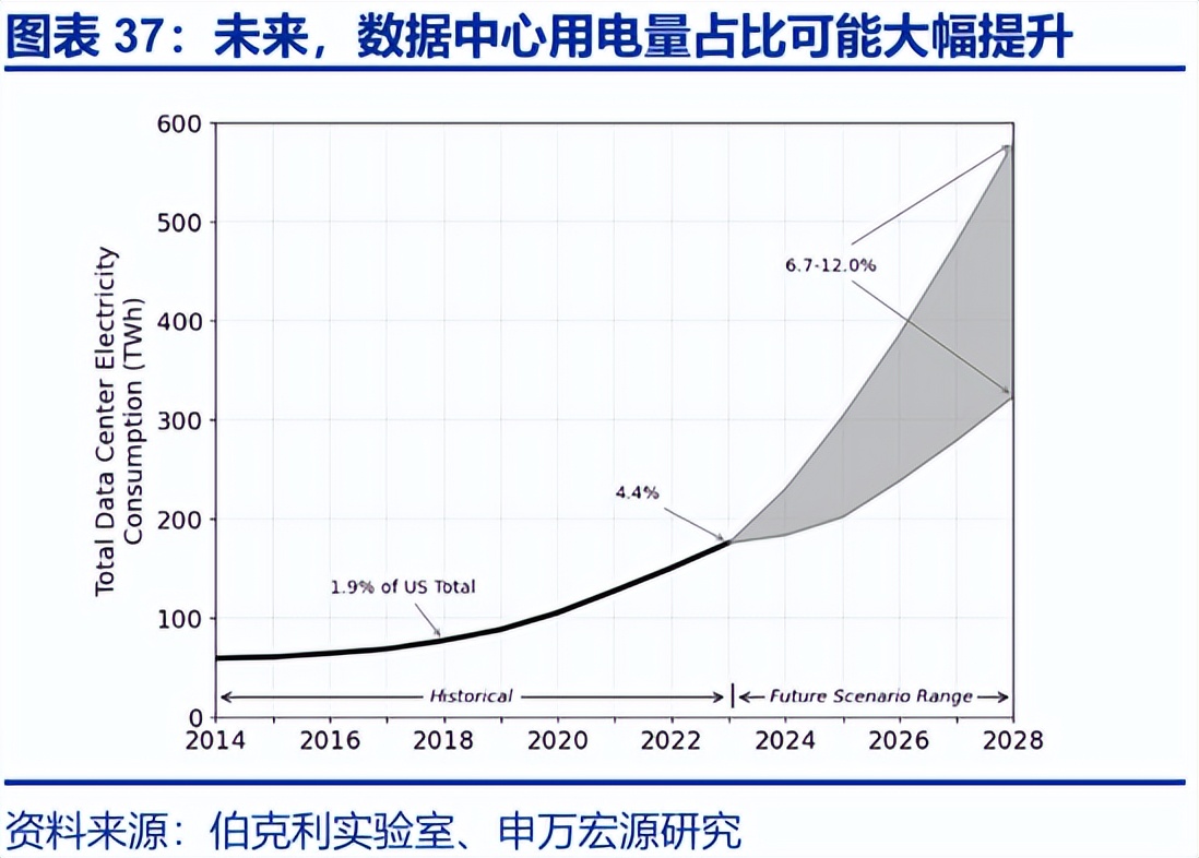 3)AI的发展导致数据中心用电需求急剧上升,未来可能面临电力瓶颈,以及电价上行问题。根据伯克利实验室数据,2023年数据中心用电占全美用电量4.4%,2028年可能提升至6.7%-12%之间。电力需求增长将推动美国加快电力基建的改造与建设。但如果电力建设持续滞后,高电价与电力瓶颈或将成为制约 AI 资本开支的重要因素。