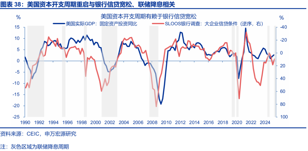 但是,从宏观层面上,美国AI资本开支仍处于“顺风”周期。美国资本开支周期具备高度“周期性”,与美联储降息、银行信用宽松周期存在联系。展望2026年,美联储仍将处于降息周期,美国经济在财政发力、关税冲击减弱下可能出现复苏,支撑资本开支周期“景气”。