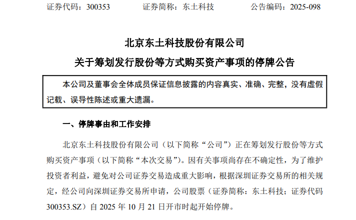 10月20日晚间,东土科技(300353)宣布正在筹划发行股份等方式购买资产事项,公司股票10月21日起停牌。东土科技预计将在11月4日前披露本次发行股份购买资产的交易方案,或者复牌并终止筹划相关事项。