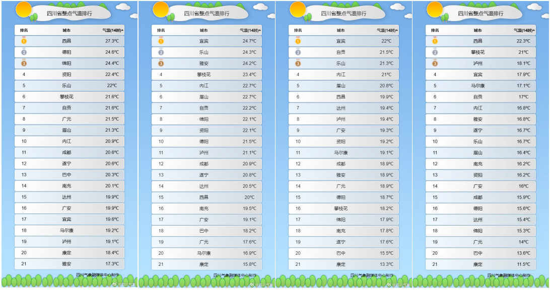 四川省气象台预计,10月下旬平均气温为:盆地13℃~16℃,川西高原 -2℃~15℃,攀西地区10℃~19℃。与常年同期平均值相比,盆地大部地方偏低(盆地常年平均气温13.2℃~18.2℃),省内其余地方正常。