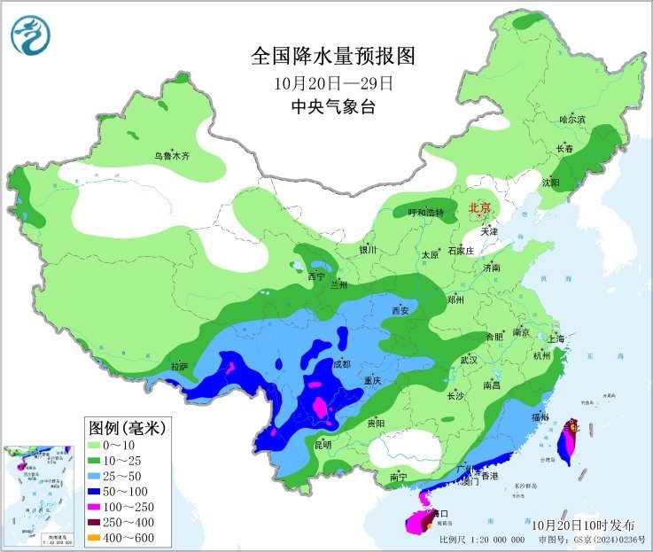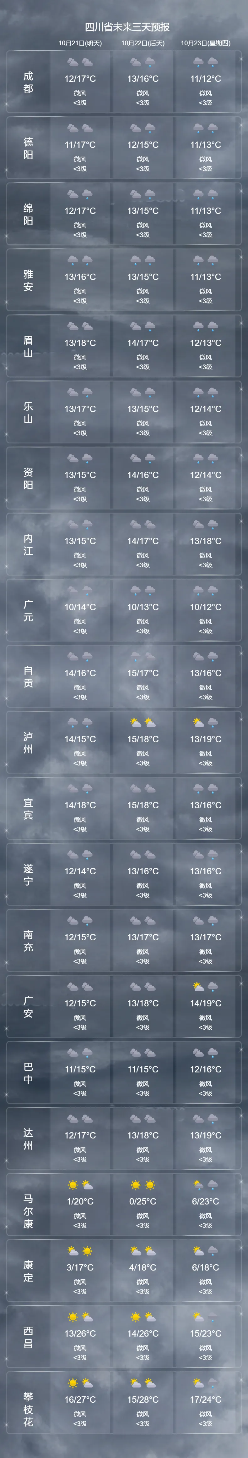 · 10月21日:盆地大部地方有小雨,南部局地有中雨;川西高原东部南部和攀西地区部分地方有小到中雨,攀西地区南部局部有大雨。