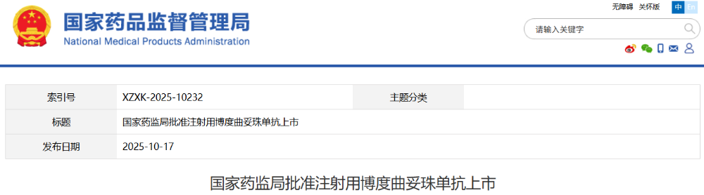 近日,国家药品监督管理局批准四川科伦博泰生物医药股份有限公司申报的注射用博度曲妥珠单抗(商品名:舒泰莱)上市,用于既往接受过一种或一种以上抗HER2药物治疗的不可切除或转移性HER2阳性成人乳腺癌患者。该品种的上市为相关患者提供了新的治疗选择。(来源:国家药品监督管理局)