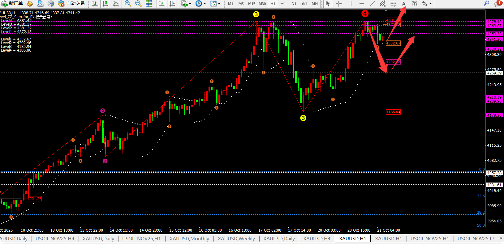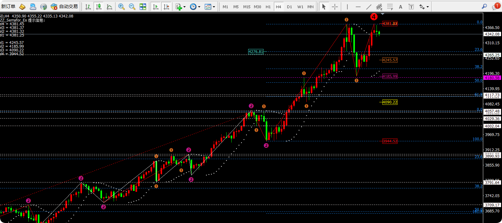 日线看今日回落并未结束,至少要到4300一线。目前就看这个4小时是高位震荡还是直接拉升。直接拉升价格会继续先涨4420附近,高位盘整价格就可能先回落。所以在4372-4377附近是可以进行一次空单策略的。至于多单需要在4267-4275附近,至于第一个多单可以在4296-97附近参与。