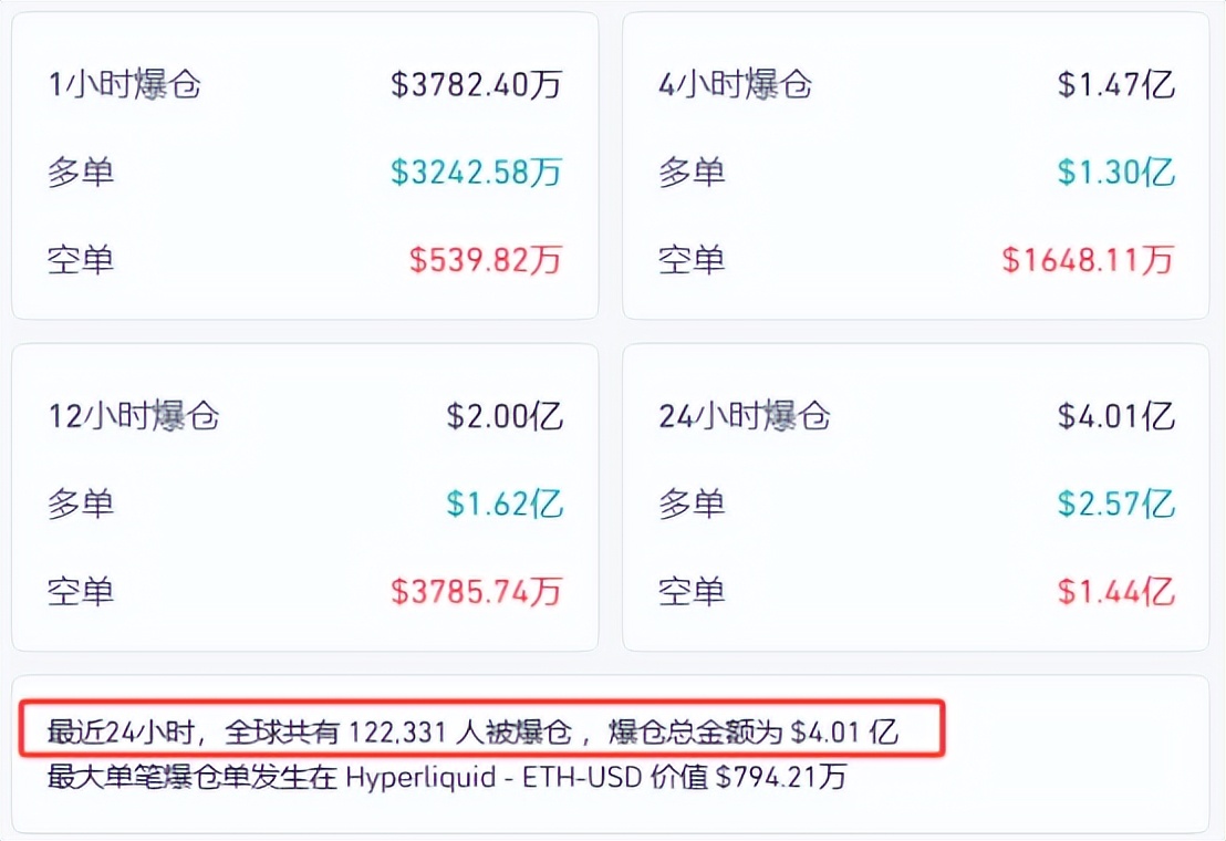 Coinglass数据显示,24小时内,加密货币全网合约爆仓超4亿美元,爆仓人数超过12万人,其中六成为多单爆仓。