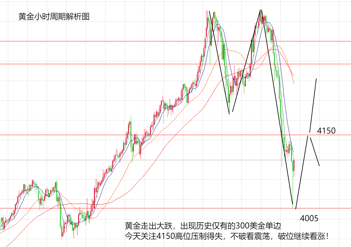 必须成功,周二是失败的一天,强调黄金前高4380之下不追高,等待回落做多,但回落的空间做任何交易对于周二的行情来说,都是送分题,虽然抓住了短线反弹的多单,但在这种单边大跌375美金的空间中,只能望尘莫及,还是在昨天市场变化中,山海比较冷静,没有过分的看多头走势,特别是在跌破4150后,山海认为,黄金有可能会出现多空的转换走势,所以,最后一直保持空仓观望,没有做任何交易,现在看来是很明智的决策。经过早上开盘,亚盘跟风,黄金再度下跌到4005附近,但是市场给出了插针的反馈,黄金很快又上涨到4100之上,早盘来回有走了100多美金,由于黄金已经跌破4150关键支撑点,现在山海要考虑一下黄金的多空趋势变化,今天多空都有表现的机会,空头延续的话,破位4000黄金就会泄洪,去3680都有可能,但是多头反攻的话,破位并且站稳4150,在去4350的可能性也有,所以,在这种极限行情中,没有办法归类看待多空走势,要根据盘中表现再看。也就是说,如果今天黄金站稳4150之上,可以开始做多看涨,当然,如果早上在低位做多了的朋友可以持有多单,看4150是否破位,如果今天未能站稳4150之上,再考虑做空也不迟。