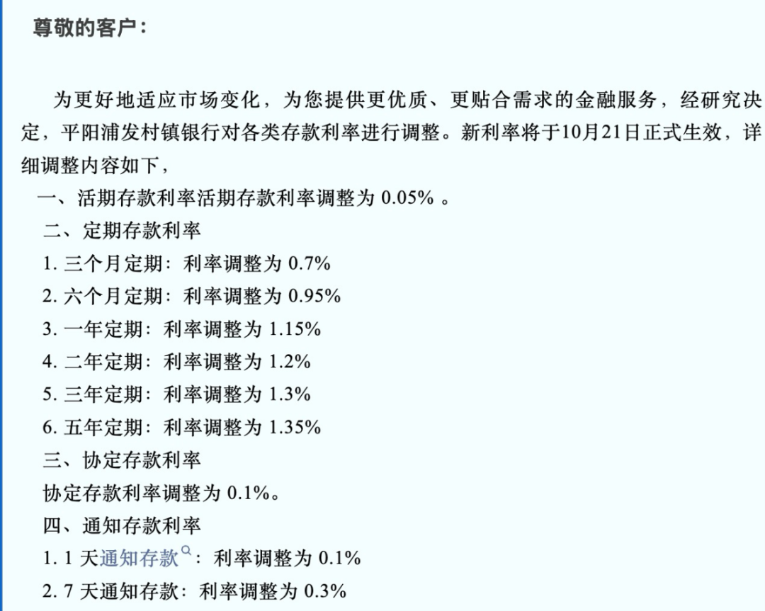 其中,平阳浦发村镇银行公告显示,10月21日起新一轮各类存款利率调整生效,与此前相比,该行整存整取定期产品三个月期、六个月期、一年期、二年期、三年期、五年期分别下调40个、35个、35个、50个、80个、80个基点。