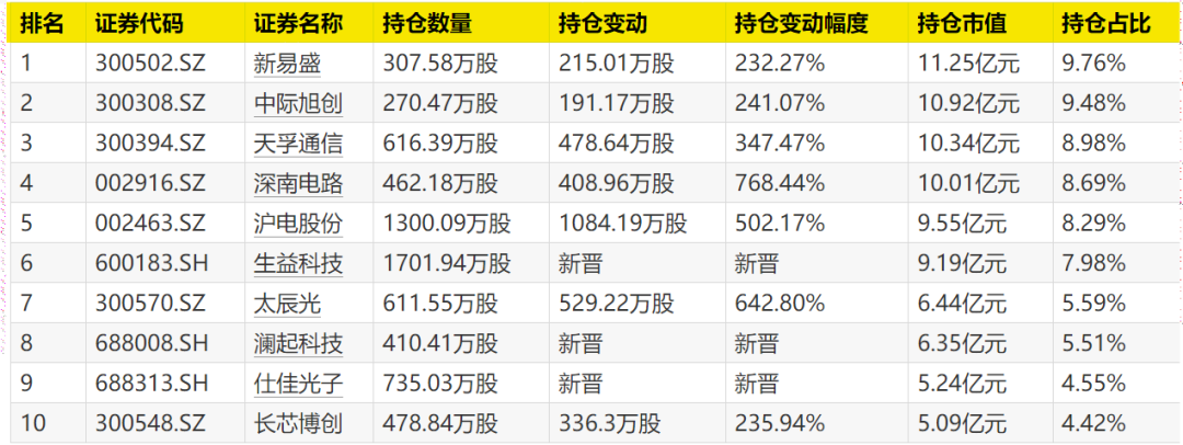 增持方面,沪电股份、太辰光、天孚通信均获大幅加仓,加仓幅度分别为502.17%、642.80%、347.47%,持仓市值在5亿元~12亿元区间不等。