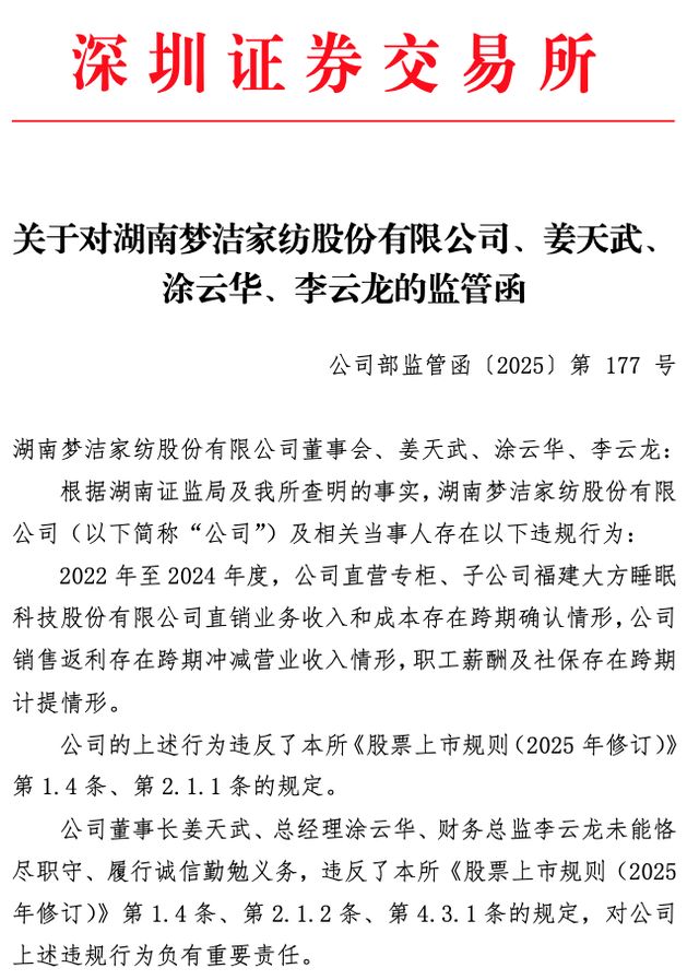 湖南梦洁家纺股份有限公司(证券代码:002397,以下简称“公司”)于2025年10月20日披露公告称,收到中国证券监督管理委员会湖南监管局(以下简称“湖南证监局”)出具的《行政监管措施决定书》。同时,深圳证券交易所亦对公司及相关责任人下发监管函。