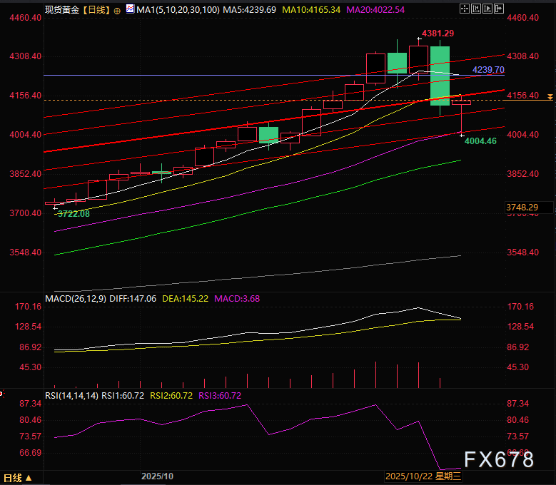 从日线图可以看出金价触及上升通道下轨后开始反弹,目前受制于上升通道的上轨和10日线,也是近期的阻力位,金价后续最大压力位在4239.70也是10月21日金价下跌阴线的50%分位。