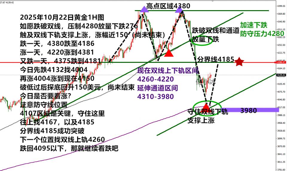 等于,就是价格跌破小时图双线,从双线上轨4280跌到双线下轨4010(超幅4004),时间不到24个小时