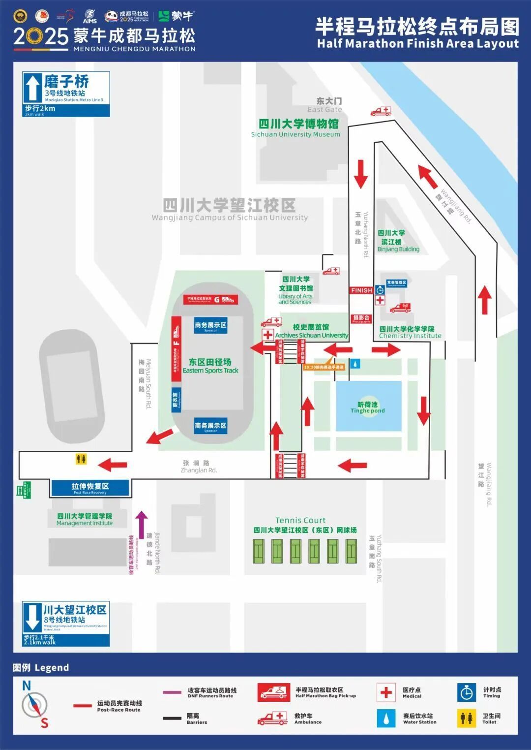 半程马拉松:金沙遗址博物馆东门(起点)→中环路青羊大道段→清江中路→清江东路→蜀都大道十二桥路→蜀都大道通惠门路→蜀都大道金河路→蜀都大道少城路→祠堂街→西御街→人民南路一段→人民南路二段→人民南路二段锦江宾馆(折返)→人民南路二段→人民南路一段→西御街→人民南路一段→蜀都大道人民东路→蜀都大道总府路→大慈寺路→东安南路→东安北路→新华大道双林路→新华大道双林路交二环路(折返)→新华大道双林路→一环路东三段→一环路东四段→一环路东五段→顺江路→三官堂街→石牛堰路→河滨路→新九眼桥→望江路→四川大学望江校区(终点)