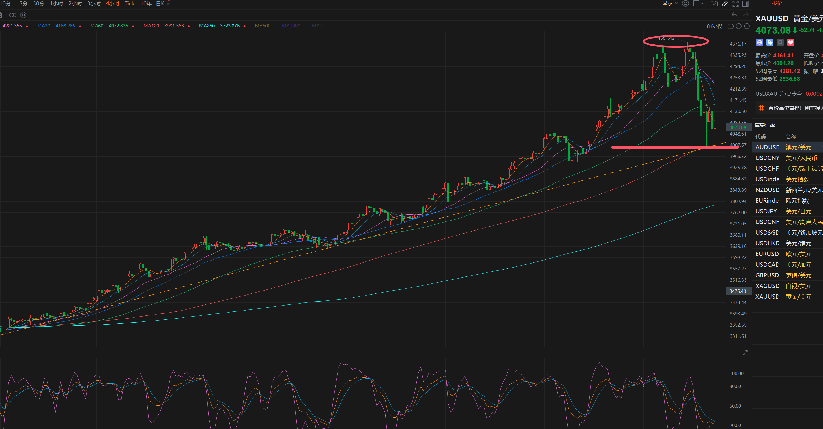 短线而言,两个交易日内,金价最大跌幅将近380美金,已经大大消耗了空方的力量。而且今日早盘最低也触及到了4000美金这个大整数关口,短线超卖严重,不适合再过度追空。可以先依托4000关口,做200美金左右的区间震荡,侧重点是高空,多单则作为辅助手段,打快手交易。