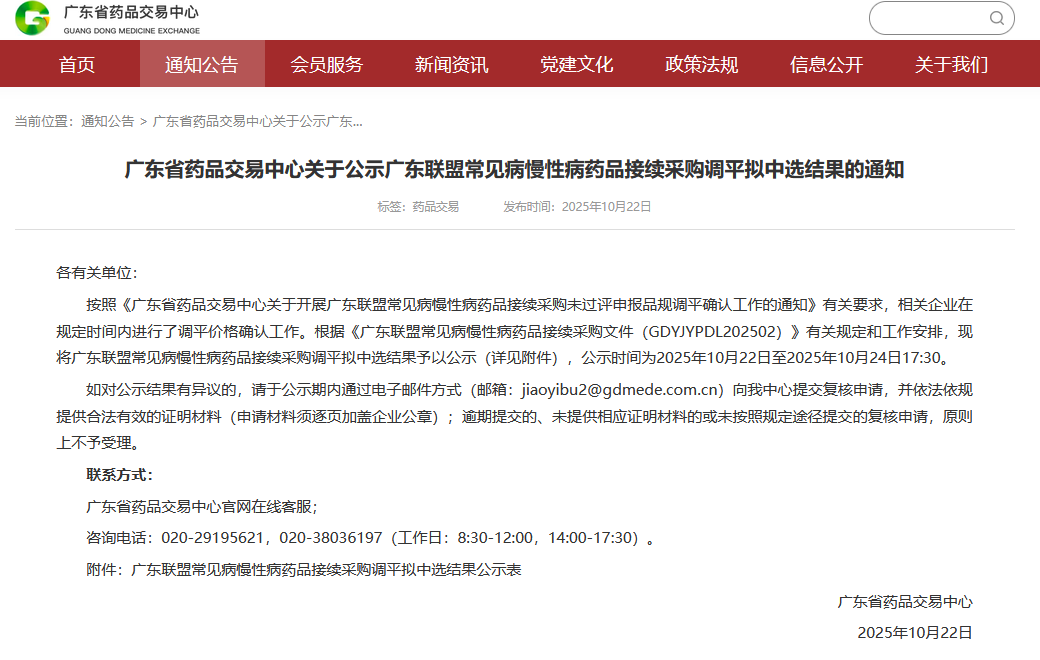 2025年10月22日,广东省药品交易中心正式发布通知,对广东联盟常见病慢性病药品接续采购调平拟中选结果进行公示。这一涉及医药行业采购格局的重要节点,将在未来3天内决定相关药品的市场准入资格,企业需密切关注关键时间窗口。