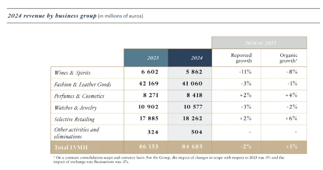 那时也是奢侈品巨头与美妆业务的“蜜月期”。有媒体报道称,美妆和香水单价相对成衣、皮具等核心奢侈品更低,是年轻人接触奢侈品世界的“入门券”,能帮助品牌培育未来的核心客户。其高利润率也成为了奢侈品巨头提振业绩的“利器”。以LVMH2024年财报为例,香水和化妆品业务以及丝芙兰所在的精品零售成为集团唯一增长的两个部门。