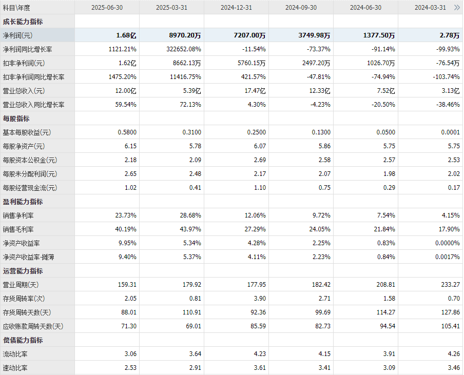 2、此前公司公布2025年中报业绩,实现营业收入12.00亿元,同比59.54%,归母净利润1.68亿元,同比增长1121.21%。