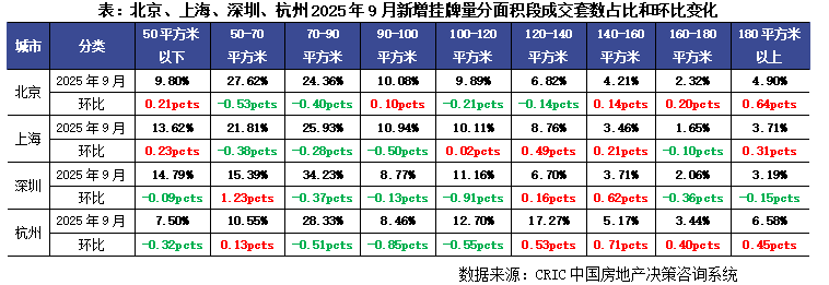 总体来看,9月,重点四城二手房新增挂牌量持稳,但城市间分化显著。北京、深圳同环比双双增长,上海同比涨幅超2成,反映出业主信心有所恢复、出售意愿增强。唯独杭州同环比分别下降41%和12%,挂牌积极性稳步回落,市场情绪相对谨慎。结合总价段和面积段综合分析可以看出,京沪深杭高总价800-3000万元、大面积120平以上房源业主挂牌活跃度较高。